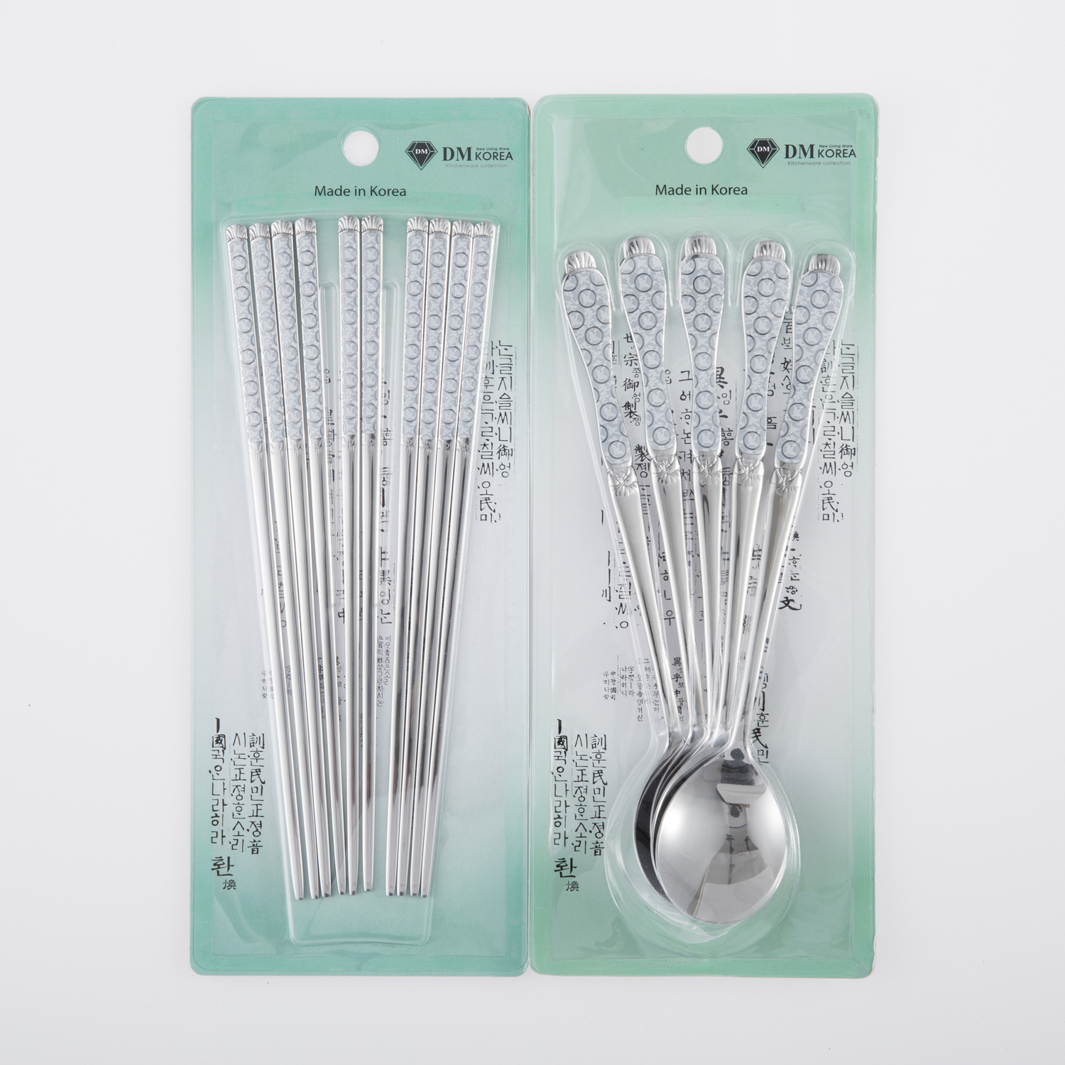 DM KOREA 韩式传统勺子和筷子套装,五个勺子,五个筷子。1、韩国传统图案设计,花纹图案都是激光打印,不易被洗掉。2、采用不锈钢材质,不易变形、弯曲,长久耐用。3、正宗的韩式料理筷,在家就能享受正宗的韩式料理。